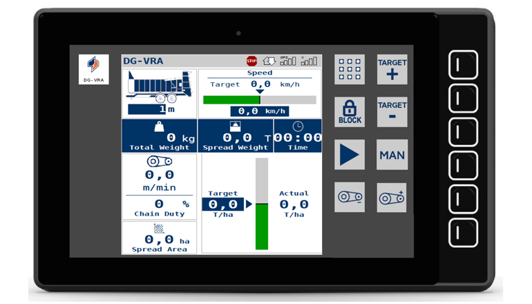 La DG-VRA regula la aplicación en modo AUTO basándose en la tasa objetivo, al tiempo que permite el modo MAN con control directo del operador sobre la velocidad de la cadena mediante PWM. Durante el trabajo, el operador puede ajustar la tasa objetivo en cualquier momento para una mayor flexibilidad sobre el terreno.
