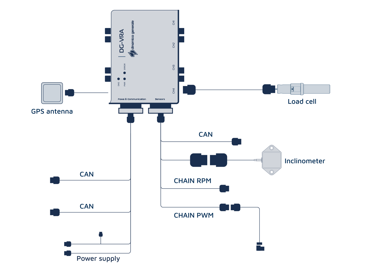 La DG-VRA presenta una arquitectura modular diseñada para una integración perfecta en las esparcidoras de estiércol, combinando múltiples entradas y salidas para un control preciso del proceso de esparcimiento. La ECU se conecta directamente a las células de carga para medir el peso en tiempo real, garantizando una aplicación precisa basada en la masa. Las entradas adicionales incluyen la velocidad de la cadena (RPM) y el control de la cinta (PWM), permitiendo la regulación en bucle cerrado del sistema de transporte interno.