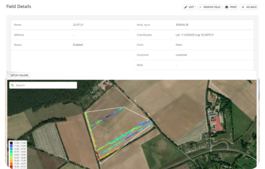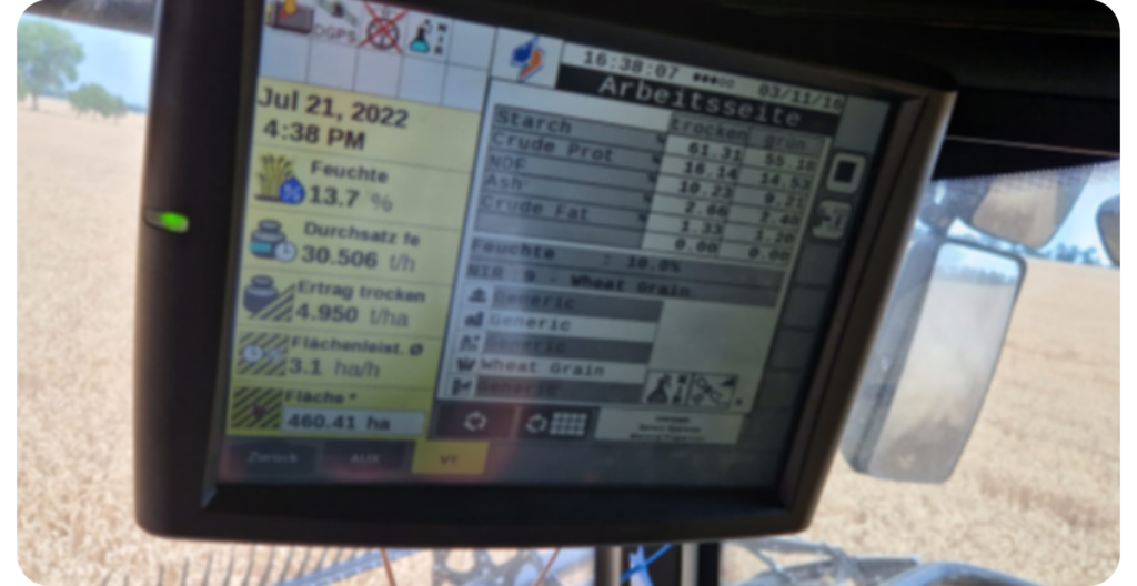L’essai sur le terrain a été réalisé en juillet 2022 dans le nord de l’Allemagne sur une culture de blé récoltée à l’aide d’une moissonneuse-batteuse New Holland CR8.90. Le capteur EVONIR a été installé sur l’élévateur à grains, permettant une analyse directe de l’ensemble du flux de grains pendant les opérations de récolte. EVONIR a été connecté via ISOBUS à la Connectivitй de la moissonneuse-batteuse.