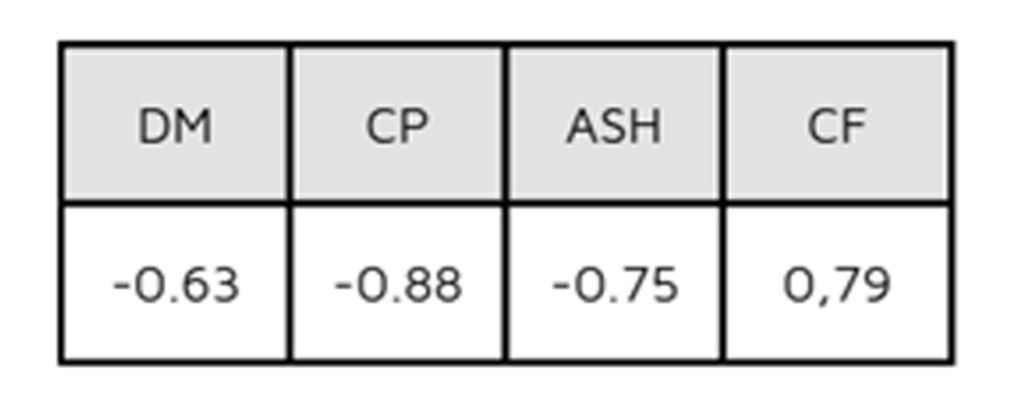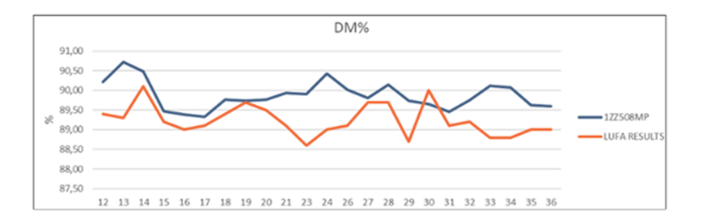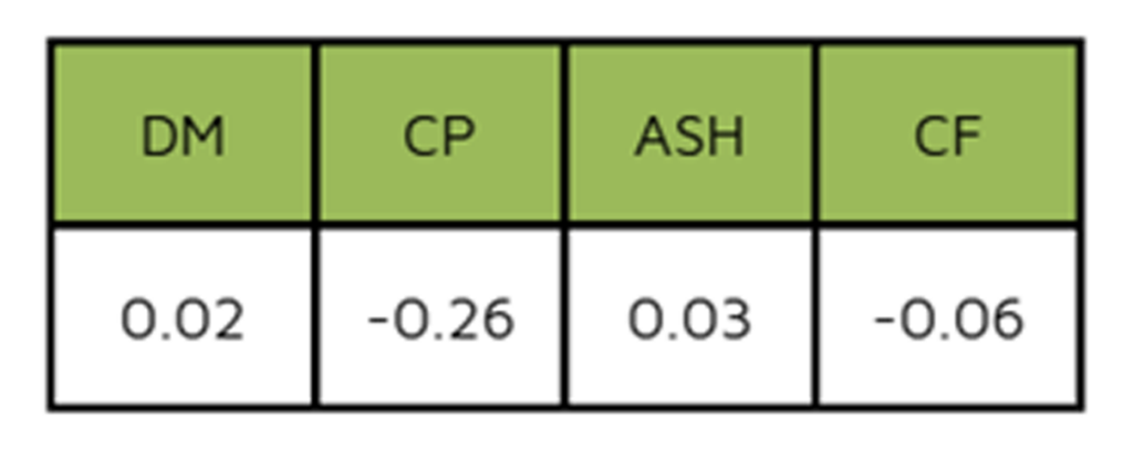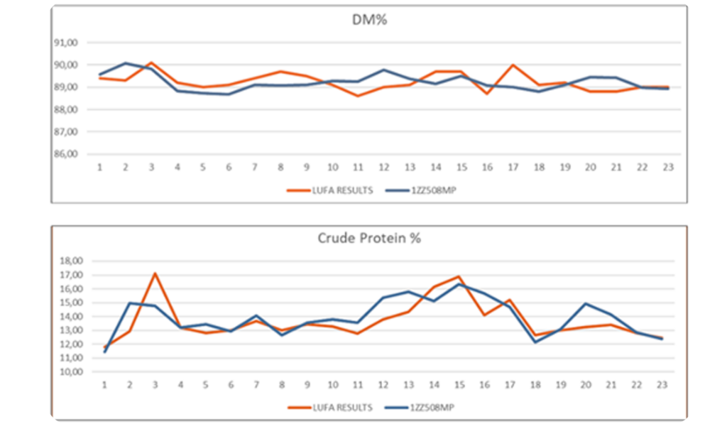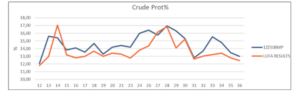 En comparant les mesures NIR avec les résultats de laboratoire utilisant l’étalonnage standard de l’usine, les écarts moyens se sont avérés être de -0,63 pour la matière sèche, -0,88 pour les protéines brutes, -0,75 pour les cendres et +0,79 pour les matières grasses brutes. Ces valeurs indiquent un biais relativement faible pour tous les paramètres, surtout si l’on considère qu’aucun étalonnage spécifique au champ n’a été appliqué à ce stade.